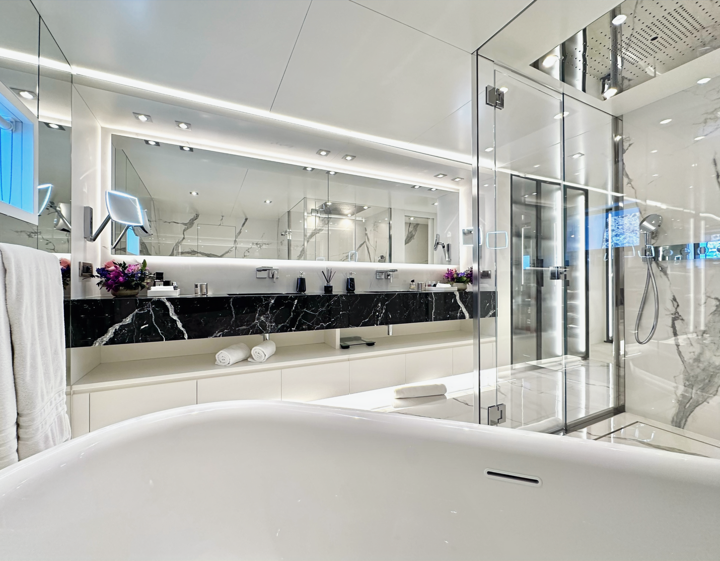 Experience unparalleled luxury aboard the Vertigo Yacht's modern masterpiece: the super luxurious master cabin. Indulge in the spacious walk-in wardrobe and retreat to the en suite bathroom, complete with a huge rain shower and jacuzzi bathtub. Immerse yourself in opulence and redefine the art of yachting.